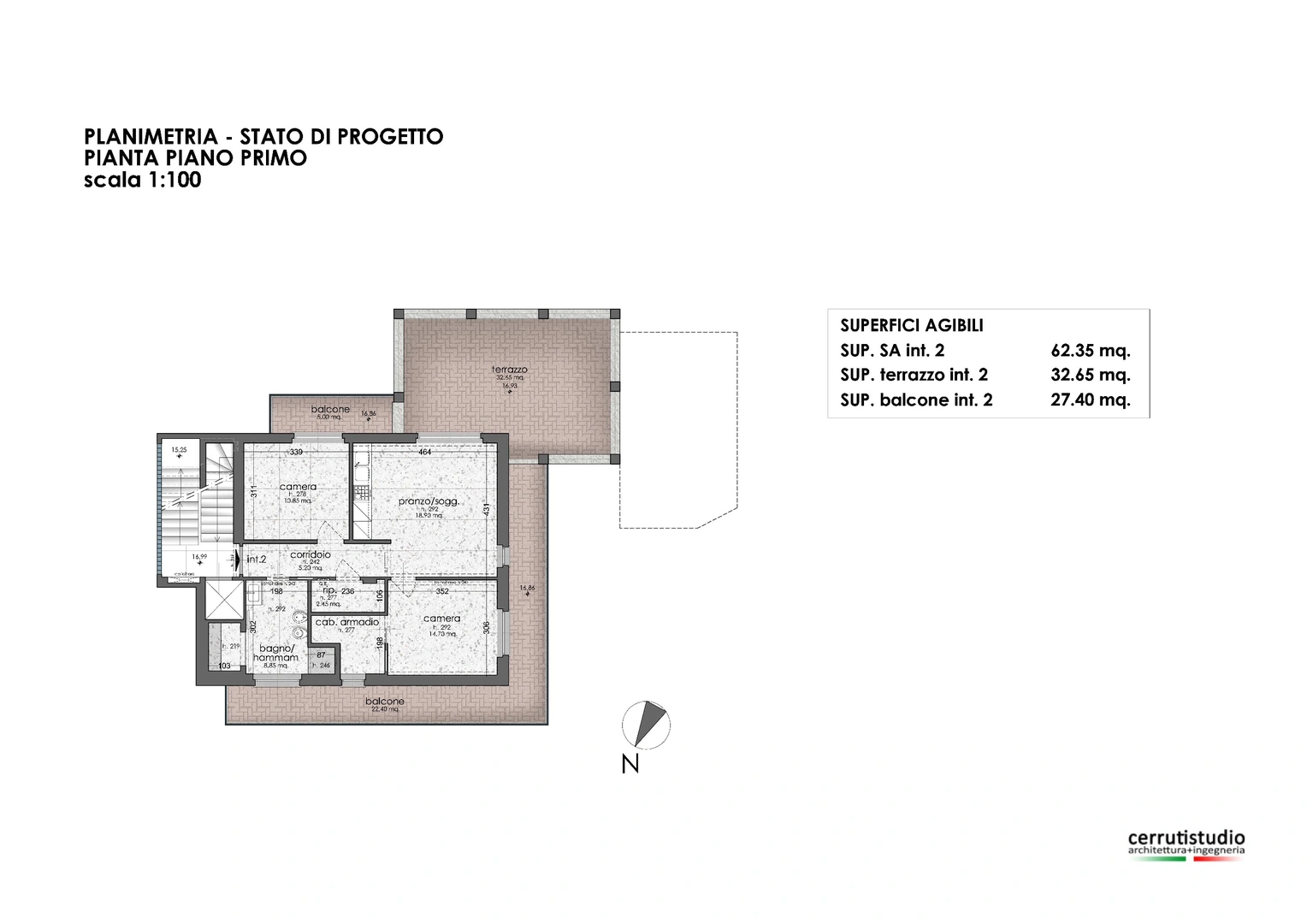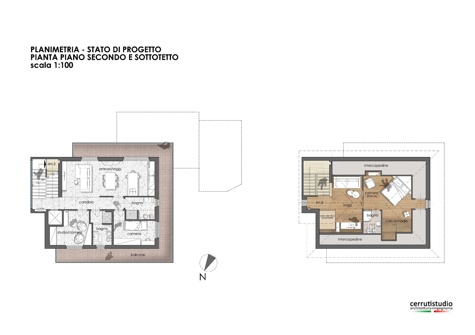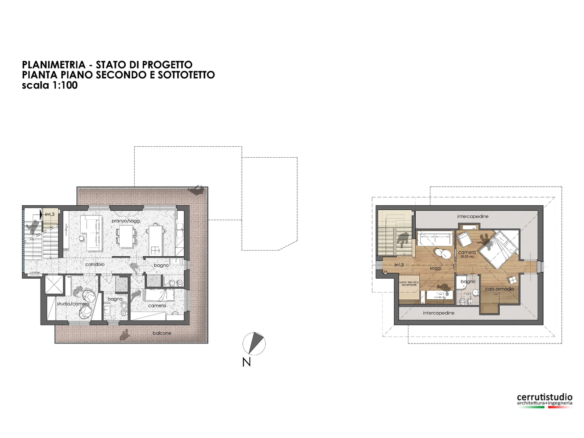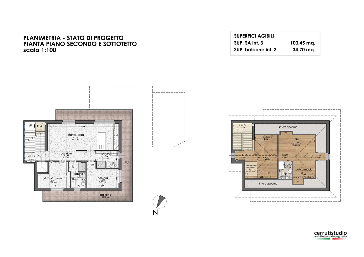Si propone interno 3, piano secondo e sottotetto abitabile, composto da: vano scala su ingresso con corridoio, una camera da letto, un locale studio, soggiorno con cucina di mq 25, due bagni, una lunga balconata gira attorno alla casa fermandosi al vano scala. Il locale sottotetto presenta due ampi locali mansardati con travi a vista in legno, soggiorno di 20 mq e una camera da letto con bagno privato e cabina armadio. Pertanto l’immobile ha una superficie commerciale di vendita di 115 mq, di cui interni calpestabili sui 105 mq e 35 mq di balcone.